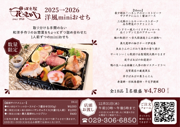 2025→2026洋風miniおせち注文開始しました 2025-11-01 22:06:08 ご注文はコチラ▶︎ご予約フォームへ◀︎花きゃべつの洋風おせち、2025年は400個限定です今年はおととしまでご好評いただいておりました、1人前ずつ個包装のminiおせちに戻してご用意いたします。美味しい年末を皆様が迎えられるように、ご用意させていただきます。お電話でもご注文・ご質問受け付けております→【050-8889-7323】